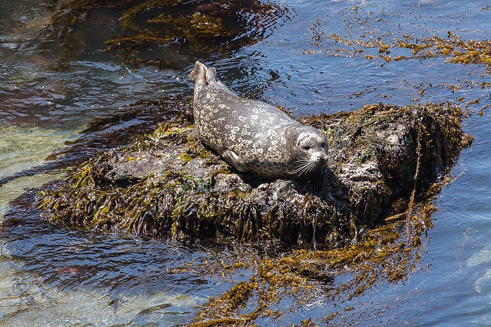 They usually eat and sleep on their backs. You won’t find many that come ashore although harbor seals and the California Sea Lions (that depart in July for southern waters) can occasionally be seen lounging on the rocks.