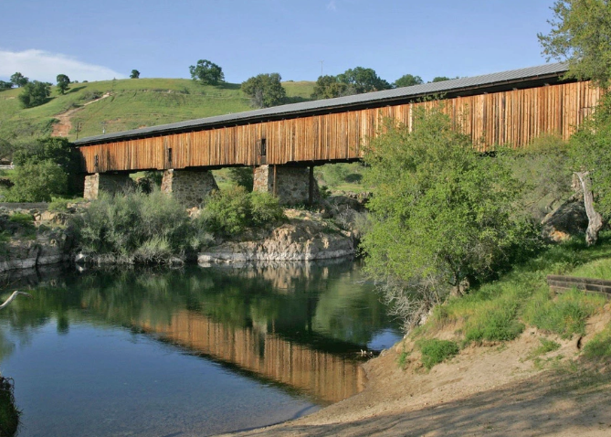 Built in 1863, the covered bridge spanning the Stanislas River east of Oakdale a mile north of Highway 108/120 via Sonora Road is considered one of the best-preserved 19th century wood-iron Howe truss bridges still around.