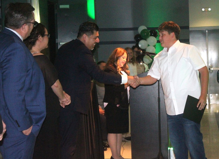 Finally, Superintendent Chavez announced the Accountability award recipients, recognized for demonstrating responsibility, integrity and ownership of their actions. Receiving that honor were Lucia Saucedo, fifth grade, Collegeville; Logan Lanza fifth grade, Dent; Alexa Castillo, third grade, Farmington; Hannah Bianchini, fifth grade, Van Allen; Abraham Flores, sixth grade, Gateway; Jace Estrella, eighth grade, El Portal; Brien Novetzke, junior, Escalon High.