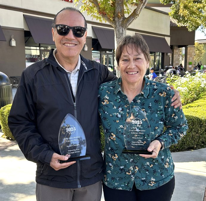 Saturday’s Great Valley Bookfest in Manteca included honors for a couple of area ‘Literacy Heroes’ – Manuel Camacho and Marg Jackson. Camacho started his career as an educator in 1993 where he taught Spanish at Canoga Park High School for 10 years. He moved to Stockton 22 years ago and has been teaching Spanish at San Joaquin Delta College as a full-time faculty member. He is also a storyteller and has participated in storytelling events throughout the Central Valley for over 20 years. Jackson, editor of the Escalon Times, Oakdale Leader and Riverbank News, has worked in the Central Valley for over 30 years. Originally from upstate New York, working first in radio and then as a newspaper reporter, she came to California for the chance to be an editor. She is an advocate for literacy in the Escalon community, including covering programming in local schools, the library, the annual writing camp, and countless other programs.