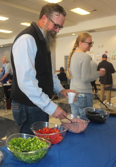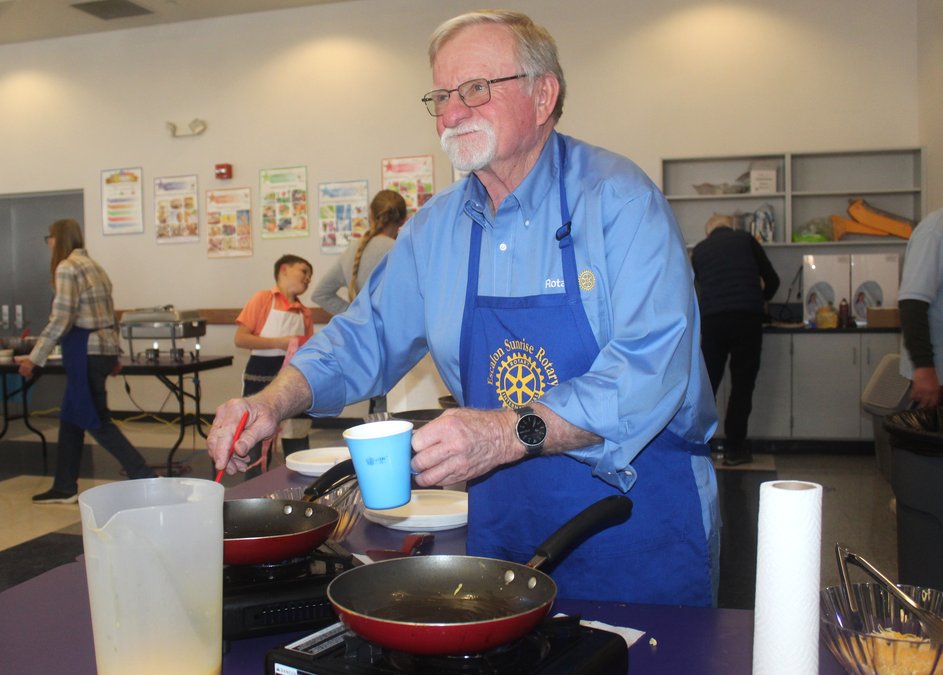 Members of the Escalon Sunrise Rotary Club – along with some volunteer helpers – put on another successful Super Bowl build-your-own omelet breakfast on Sunday morning, Feb. 8. Rotarian John Weeks was among those manning a frying pan to cook up the omelets while diner RJ Jefferson selected his omelet fillings from the many options available. Those attending also topped off their plates with fruit, pastries and biscuits and gravy, as well as choosing water or juice with Rotarian Dave Mantooth there to assist as needed. There were also a number of prize drawings as part of the event, hosted in the Escalon High School cafeteria.