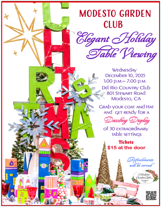 The Modesto Garden Club will host its Elegant Holiday Table Viewing at Del Rio Country Club, 801 Stewart Road, Modesto on Wednesday, Dec. 10 from 1 p.m. to 7 p.m.