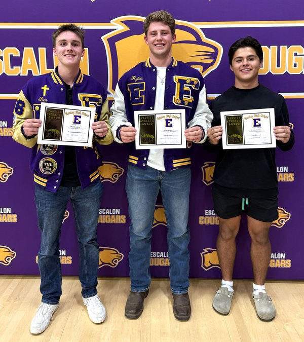 Recognized at the recent Sports Awards Night for their contributions this football season was a trio of Escalon varsity players – all of whom were injured early in the preseason schedule and were not able to return to the field. But their presence on the sideline and guidance of younger players earned these seniors some honors. From left, Ben Ferreira, Most Inspirational Player; Rylan Koops, Coaches Award; Ben Gonzalez, Coaches Award.