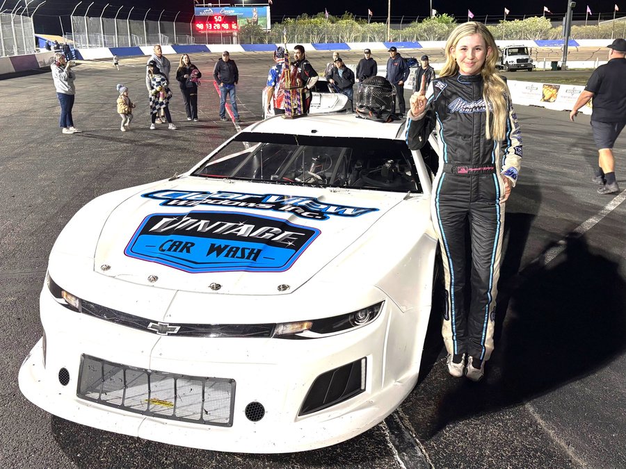 On the penultimate lap, Stepps made her move by bumping her way under Garland heading into Turn 3. Garland was able to inch ahead heading down the front straight to take the white flag, but Stepps dove low going into Turn 1 and pushed Garland up the track just enough to take the lead. As the crowd in the grandstands roared with approval, she was able to hold off Garland for the rest of the lap to take the stunning victory by about a half of a car length.