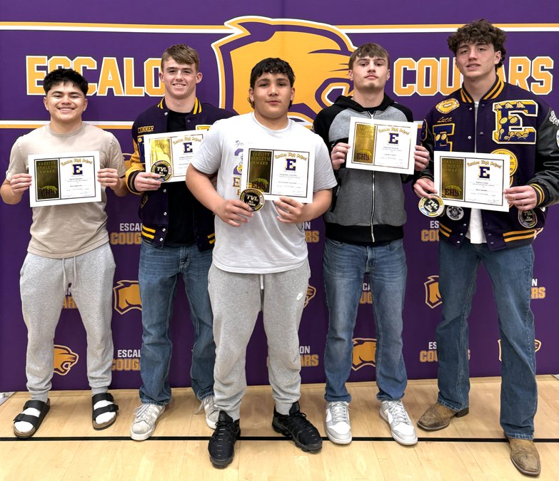 In a solid season for the wrestling Cougars, several grapplers took home team honors. Recognized for their efforts on the mats recently were, from left, Jacob Morales, Most Improved; Conner McDowell, Most Outstanding Lightweight, All-TVL; Leo Carrillo, Most Outstanding Upperweight, All-TVL; Houston Sizuela, Coaches Award; Luca Cerasi, Most Valuable Wrestler, All-TVL.